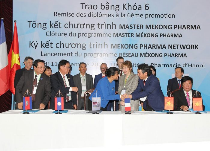 Cette cérémonie marque la clôture de ce programme de formation post graduée en sciences pharmaceutiques ayant formé 133 spécialistes et permit la construction d’un réseau de professionnels du médicament en Asie du Sud-Est. Cet événement a été l’occasion de réunir l’ensemble des Alumni Master Mékong Pharma, de confirmer auprès des autorités l’importance de former les professionnels du médicament au plus haut niveau dans le domaine des sciences pharmaceutiques pour garantir à la population un accès aux médicaments de qualité tant au niveau national qu’international, et d’inaugurer le nouveau programme Réseau Mékong Pharma. A cette occasion, un bilan du programme a été présenté. L’AUF l’accompagne depuis 6 ans, aux côtés de la Fondation Pierre Fabre et du consortium des universités françaises et asiatiques impliquées, avec des incidences très positives pour ses universités membres, tant en matière de formation que de recherche.