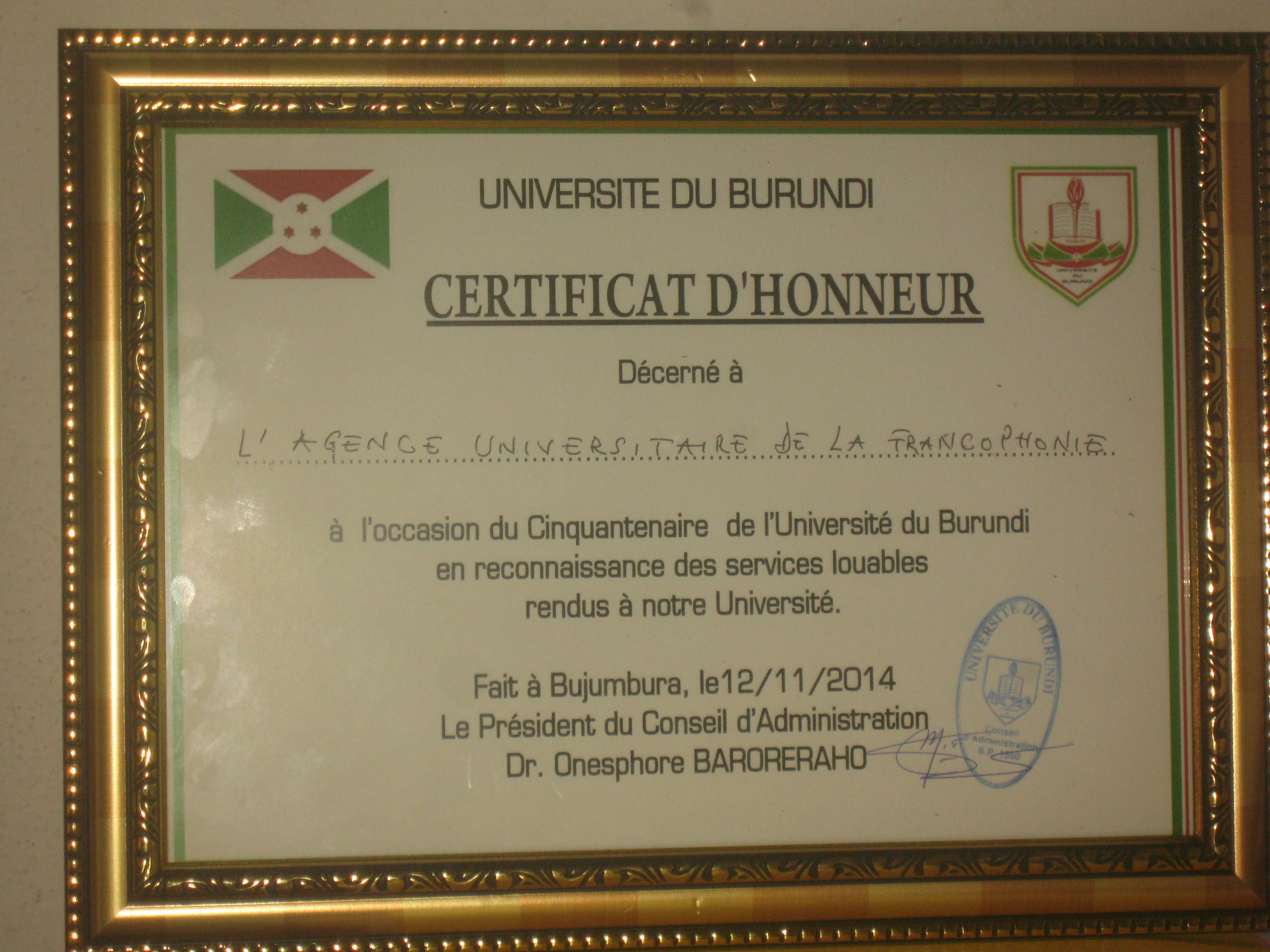 À l'occasion de la célébration de son cinquantenaire, l'Université du Burundi a décerné un certificat d'honneur à l'Agence universitaire de la...