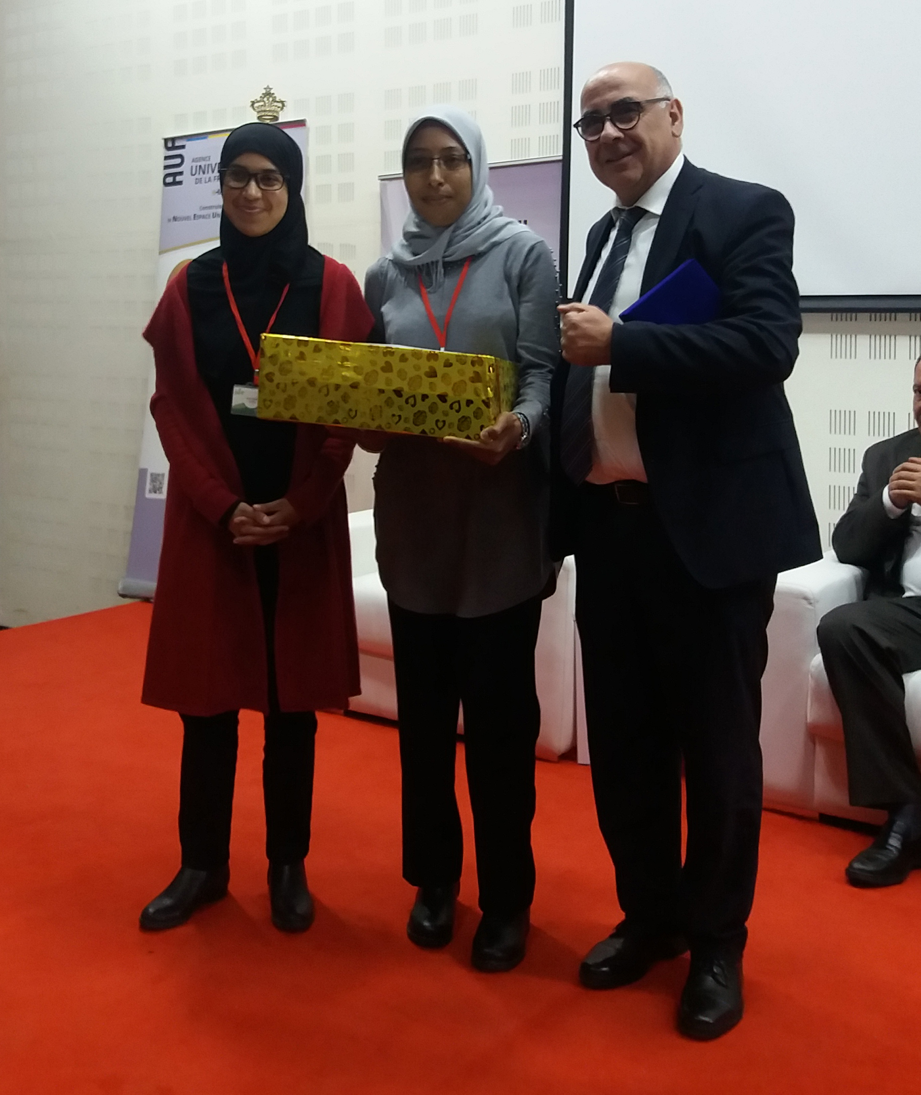 ![]() La lauréate Sara MAGHZAZ entourée de M. Mohammed ERRAMI, Président de l’Université Abdelmalek Essaadi de Tétouan et M. Mohamed LARBI KERKEB, Doyen de la Faculté Pluridisciplinaire de Larache. |