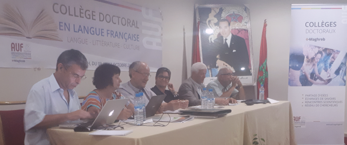 De gauche à droite: Pr Abdelouahed Mabrour, Université d’El Jadida; Pr Claude Cortier, Laboratoire ICAR-CNRS; Pr Charles Bonn, spécialiste de littérature maghrébine; Mme Hélène DEJOUX, administratrice régionale AUF Maghreb; Pr Mokhtar Sahnoun, Université de Manouba; Pr Samir Marzouki, Enseignant-chercheur.