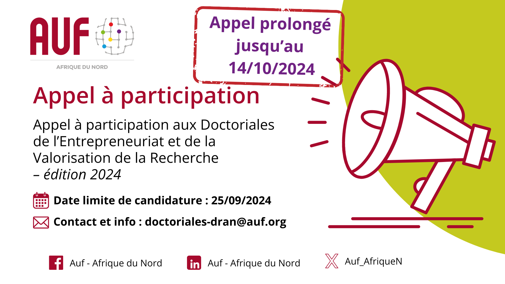 La Direction Afrique du Nord de l’Agence Universitaire de la Francophonie (AUF) lance un appel à partenariat, dans le cadre du projet Doctoriales de l’Entrepreneuriat et de la Valorisation de la...