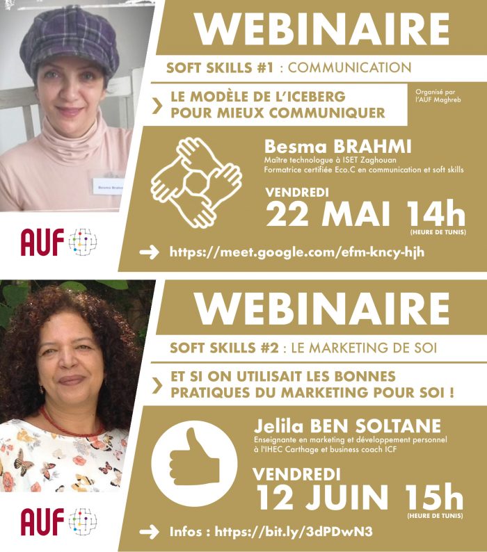 Toutes les dates et infos sur les prochains webinaires seront communiquées sur la page Facebook de l’AUF au Maghreb, n’hésitez pas à nous suivre ! > https://web.facebook.com/AUF.maghreb/