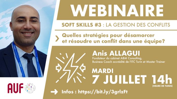 - Le troisième webinaire a traité la problématique de la gestion des conflits. Il a été animé par M. Anis ALLAGUI, Fondateur du cabinet ABM Consulting, Business Coach accrédité de l’ITC Turin et Master Trainer.