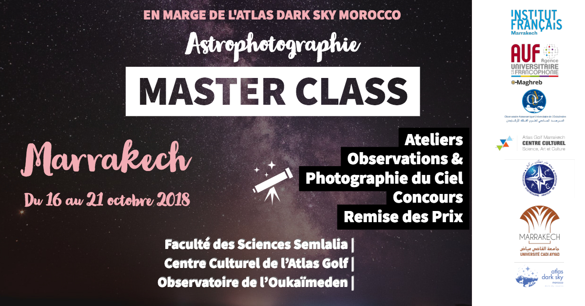 Marrakech, du 16 au 21 octobre 2018. Dans le cadre de l'"Atlas Dark Sky Morocco", avec le soutien de la Direction régionale de l'AUF au Maghreb, l’Association d’Astronomie Amateur de Marrakech, en partenariat avec l’Université Cadi Ayyad de Marrakech, l’Observatoire de l’Oukaimeden, l’Atlas Golf de Marrakech et l’Institut français de Marrakech, organise une master class en Astrophotographie .