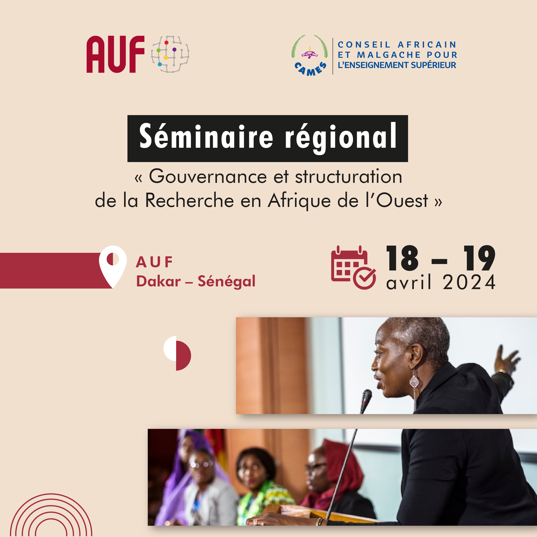 L'Agence universitaire de la Francophonie (AUF), en partenariat avec le CAMES, organise un séminaire régional à Dakar les 18 et 19 avril 2024 sur le thème de la « Gouvernance et structuration de...