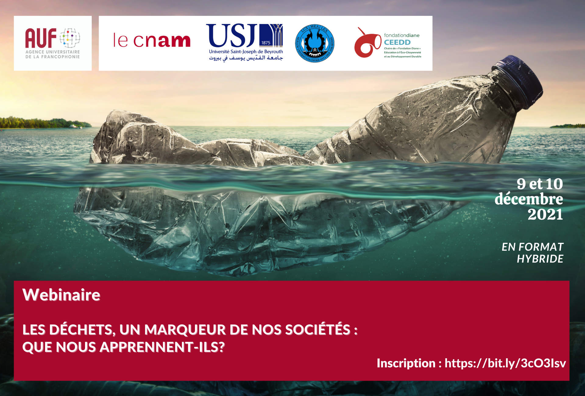 Le déchet est un des enjeux centraux du développement durable. Les Directions régionales AUF Europe de l’Ouest, Moyen-Orient, Afrique de l’Ouest, et la Chaire « Fondation Diane » pour l’éducation à l’éco-citoyenneté et au développement durable à l’Université Saint-Joseph de Beyrouth vous invitent à participer au Webinaire qui aura lieu les 9 et 10 décembre 2021, (horaires Temps universel : de 9h à 12h puis de 14h à 18h30 le 9 décembre et de 9h à 12h15 le 10 décembre), sur la plateforme zoom.