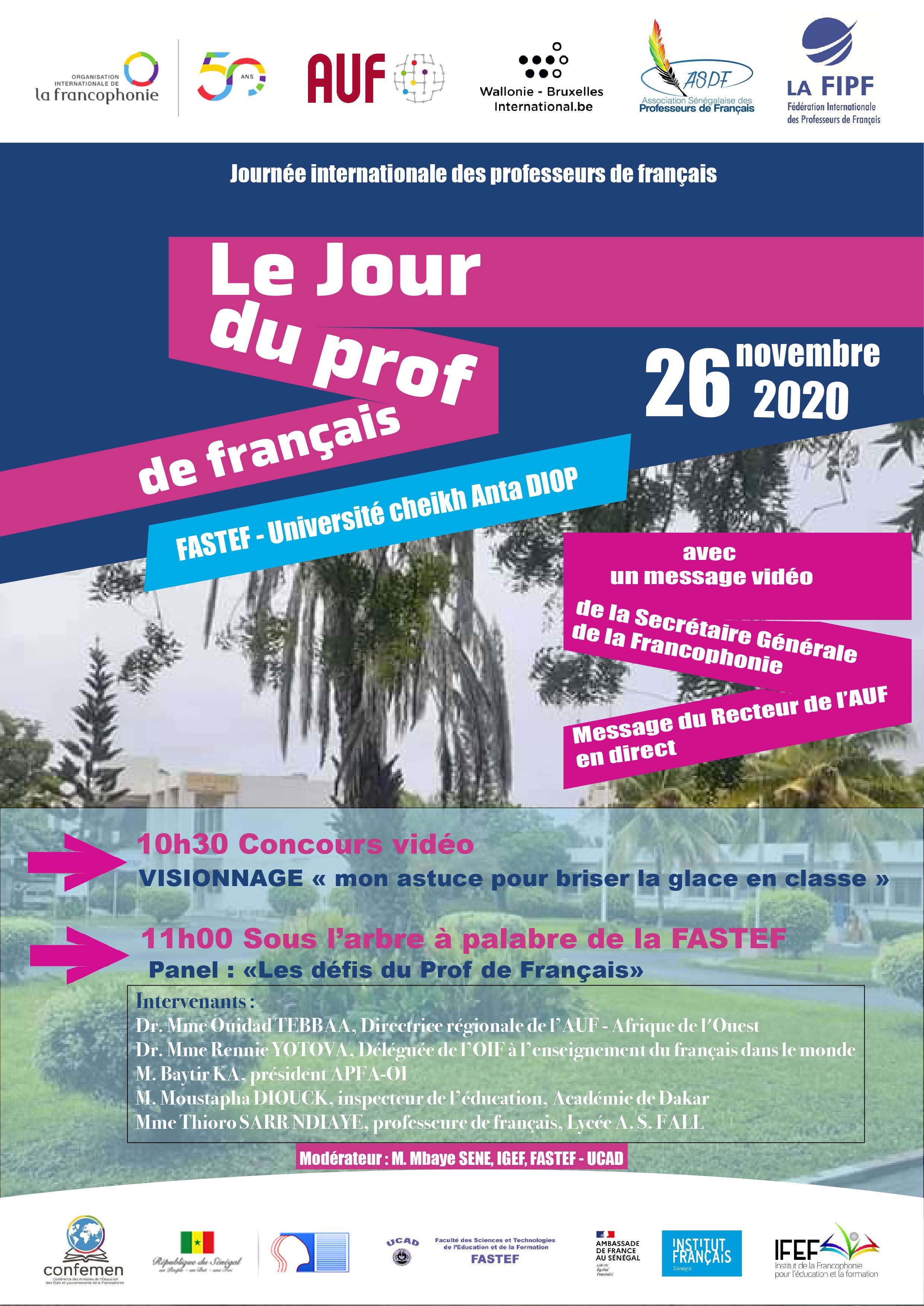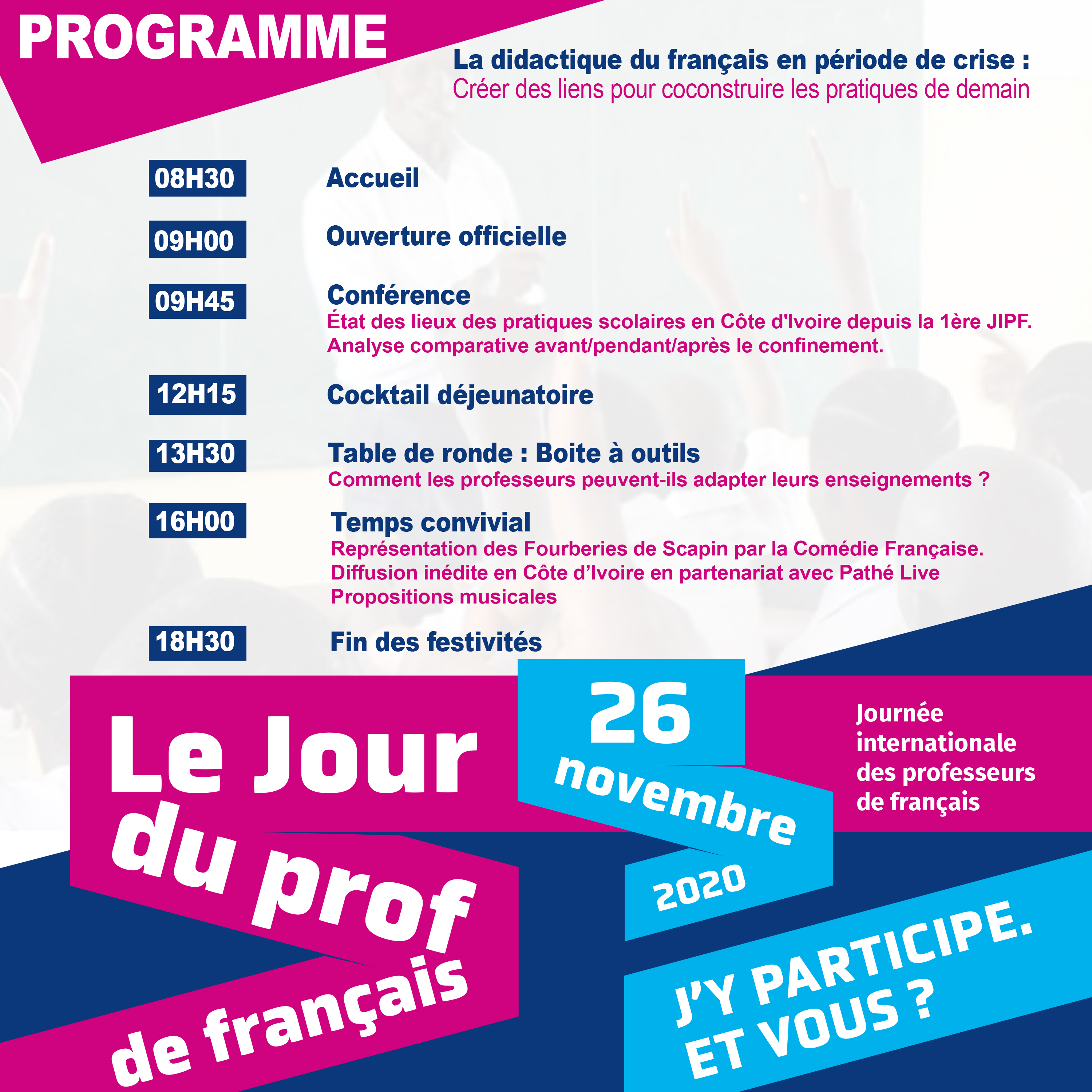 L’Association des Professeurs de Français de Côte d’Ivoire (APFCI), le Ministère de l'Éducation Nationale de Côte d'Ivoire, l’Antenne d’Abidjan de l’Agence universitaire de la Francophonie (AUF), la Commission Nationale de la Francophonie (CNF), la Bibliothèque Nationale de Côte d’Ivoire (BNCI), la Mission Laïque, l’Agence pour l'Enseignement Français à l'Etranger (AEFE) et l’Ambassade de France, via le Service de Coopération et d'Action Culturelle (SCAC) et l'Institut français de Côte d'Ivoire (IFCI) organisent le 26 novembre 2020 la Journée Internationale du Professeur de Français sur le thème : « La didactique du français en période de crise : Créer des liens pour co-construire les pratiques de demain ».