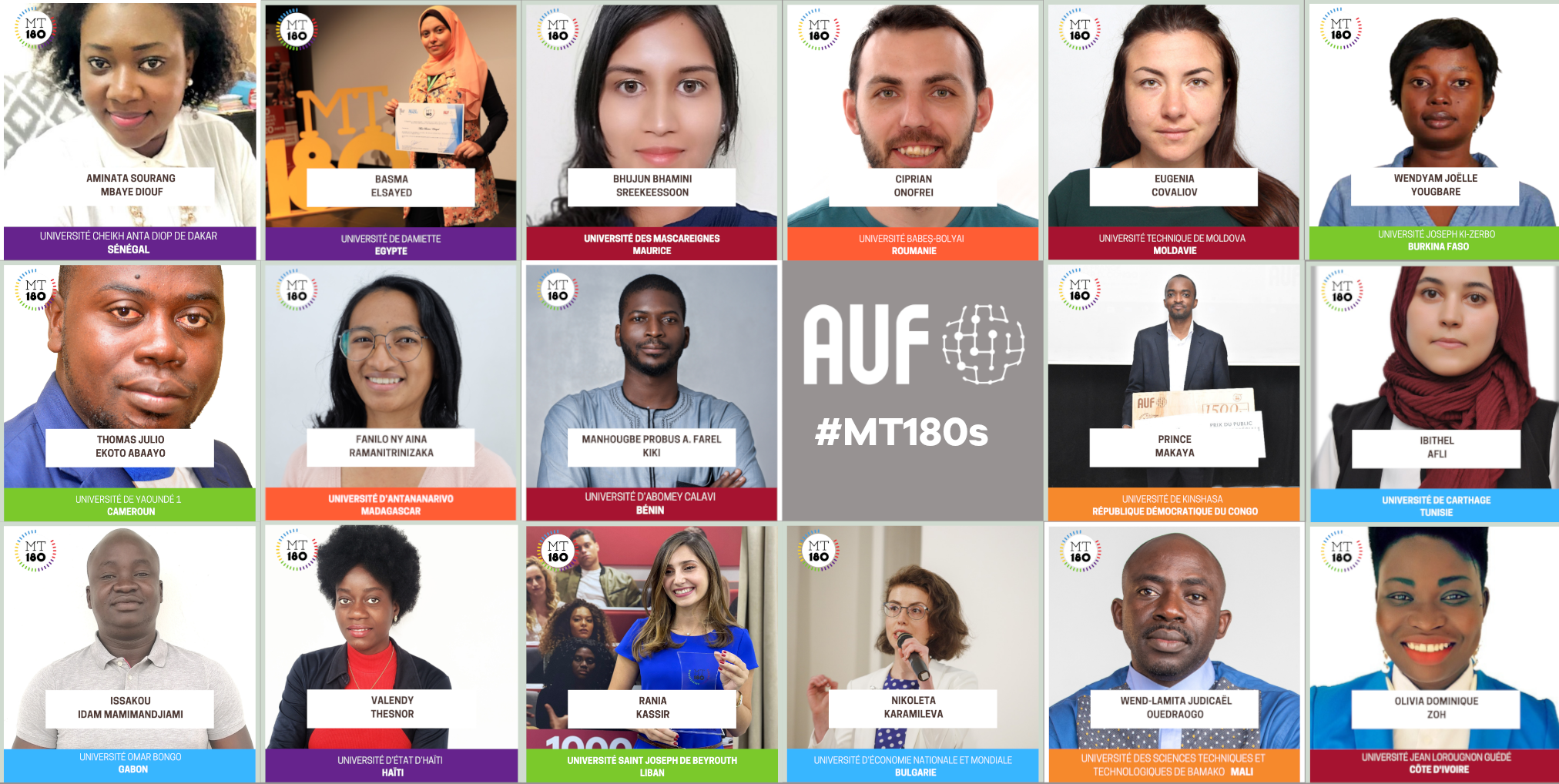 Des milliers de doctorant.e.s à travers le monde ont participé à l’édition 2021 du concours « Ma thèse en 180 secondes » (MT180), et ils ne sont désormais plus que 24 venus du monde entier : Belgique, Bénin, Bulgarie, Burkina Faso, Cameroun, Côte d’Ivoire, Consortium Europe centrale (Pologne, Autriche, Hongrie, Slovaquie), Egypte, France, Gabon, Haïti, île Maurice, Irlande, Liban, Madagascar, Mali, Maroc, Moldavie, Québec, République Démocratique du Congo, Roumanie, Sénégal, Suisse et Tunisie.