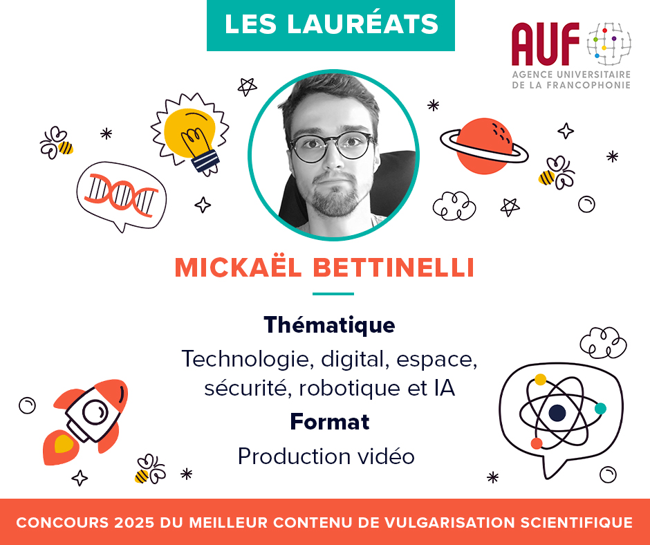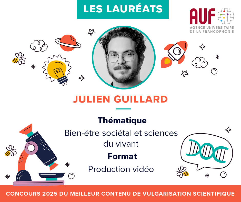 L’AUF Europe Occidentale est heureuse de dévoiler les résultats du Concours 2025 du meilleur contenu de vulgarisation scientifique. Créativité, clarté, et pertinence scientifique étaient au rendez-vous pour cette édition riche en talents. Quatre grands prix ont été attribués, ainsi que quatre coups de cœur, remis par notre partenaire l’Acfas.