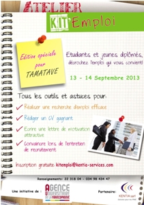 Dans le cadre de l'extension de l'atelier KIT'EMPLOI en région, deux éditions spéciales seront organisées dans les villes de Tamatave et de Fianarantsoa au cours du mois de septembre 2013....