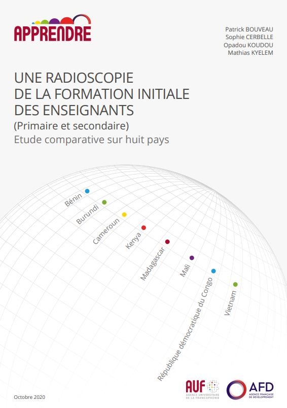 Le Programme APPRENDRE (Appui à la professionnalisation des pratiques étudiantes et au développement de ressources) a publié le 28 novembre 2020 un rapport d'étude comparative sur la formation initiale des enseignant.e.s du primaire et du secondaire dans 8 pays : le Bénin, le Burundi, le Cameroun, le Kenya, Madagascar, le Mali, la République démocratique du Congo et le Vietnam. Le rapport est accessible en ligne.