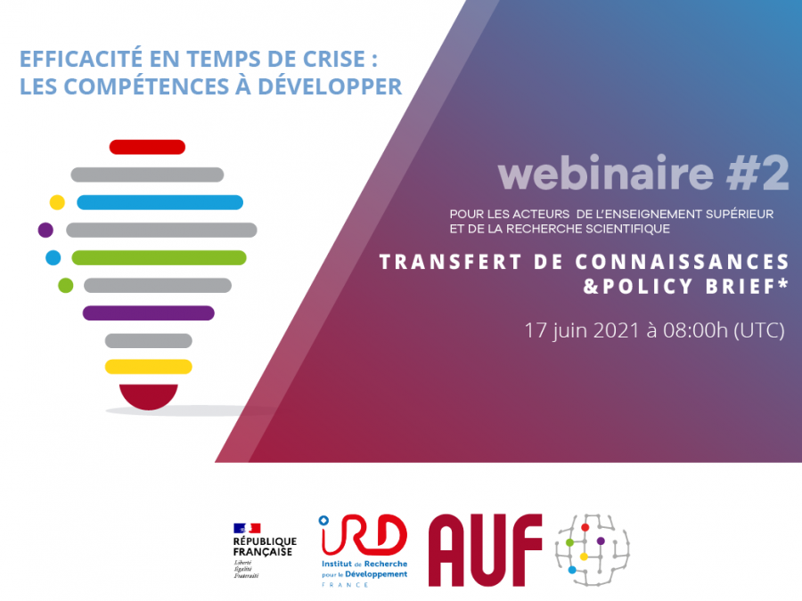 L'AUF Océan Indien et l'Institut de Recherche pour le Développement s'associent pour proposer une série de webinaires autour des compétences à développer pour être efficace en temps de crise. Le second webinaire porte sur le Transfert de connaissances et policy brief" et se tiendra le 17 juin 2021 à 8h (UCT 00).