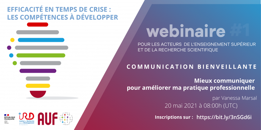 L'AUF Océan Indien et l'Institut de Recherche pour le Développement s'associent pour proposer une série de webinaires autour de "Efficacité en temps de crise : les compétences à développer". Le premier de cette série porte sur la Communication bienveillante et se tiendra le 20 mai 2021 à 8h (UCT 00).