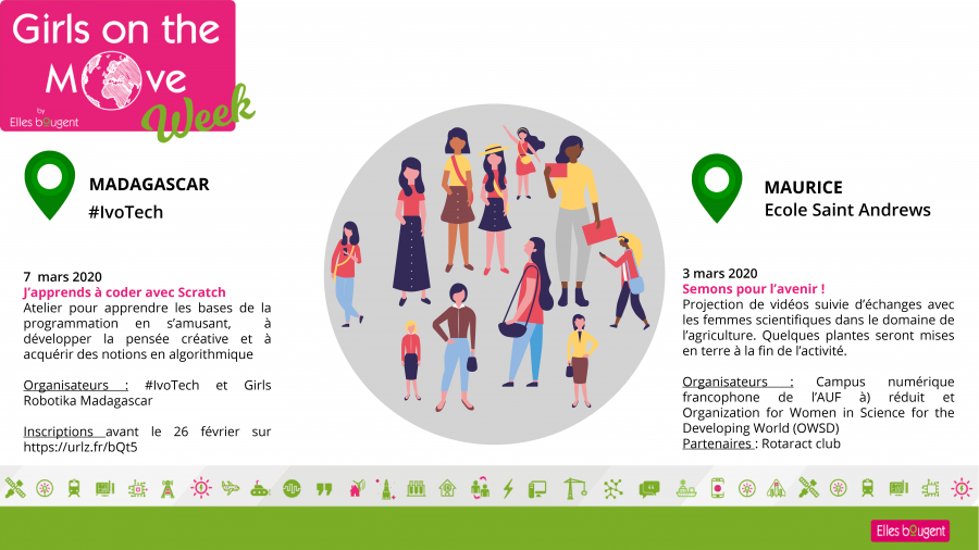 L’association Elles bougent, en partenariat avec l'Agence Universitaire de la Francophonie, renouvelle pour la 4ème année consécutive, la Girls on the Move Week, à l’occasion de la journée internationale des droits des femmes, le 8 Mars 2020. Rendez-vous aux quatre coins du globe du 2 au 8 mars 2020 !