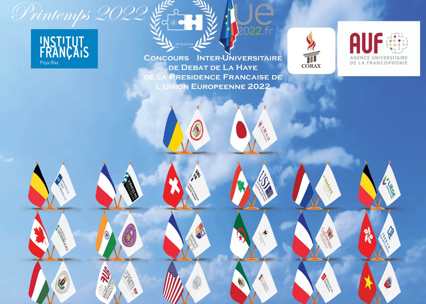 Le Concours Inter-Universitaire de Débat de La Haye réunira 32 institutions d’éducation supérieure pour débattre de sujets de droit, de Sciences Politiques, d’Économie, d’Histoire, de Culture Générale, pendant 64 matchs diffusés en direct en ligne, en rapport avec la Présidence Française de l’Union européenne 2022.