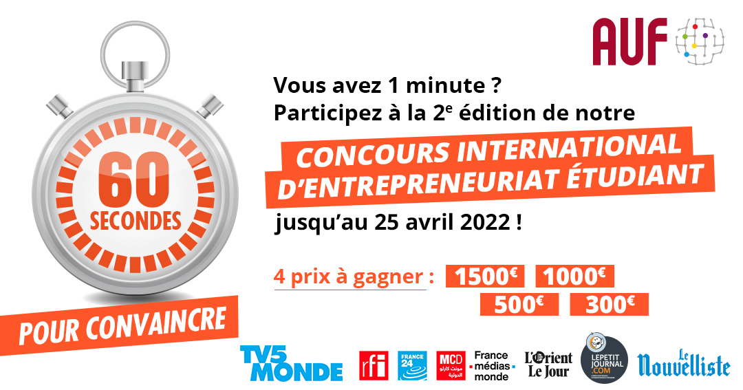 L’AUF lance, avec ses partenaires TV5MONDE, France Médias Monde (RFI, France 24, Monte Carlo Doualiya), L’Orient-Le Jour (Liban), ainsi que deux nouveaux partenaires, Le Petit Journal (Roumanie) et Le Nouvelliste (Haïti), la seconde édition du concours international « 60 secondes pour convaincre ». Il s'agit de présenter son projet en 60 secondes chrono en format vidéo. A la clé, quatre prix d'une valeur de 1 500 euros à 300 euros et la mise en relation des lauréat.e.s avec des mentors et des incubateurs. L'appel à candidatures est ouvert jusqu'au 25 avril 2022.