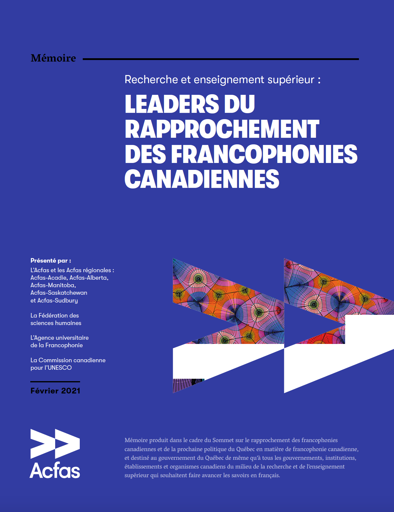 Le Comité vient de publier le mémoire « Recherche et enseignement supérieur : Leaders du rapprochement des francophonies canadiennes » destiné au gouvernement du Québec en vue de sa prochaine politique en matière de francophonie canadienne, qui sera annoncée lors du Sommet sur le rapprochement des francophonies canadiennes au mois de juin 2021.