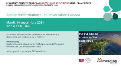 La Conversation Canada est un site web d’information universitaire membre d’un réseau comportant neuf éditions dans le monde. Durant cet atelier, Martine Turenne, rédactrice en chef de La Conversation Canada, expliquera le site, ses objectifs de diffusion du savoir universitaire au plus grand nombre, et comment les universitaires (professeur.e.s, chercheur.e.s, doctorant.e.s, etc.) peuvent y écrire et y apporter leur contribution.