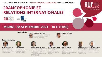 L’Agence Universitaire de la Francophonie pour les Amériques (AUF), en collaboration avec le Centre d’études et de recherches internationales de l’Université de Montréal (CÉRIUM), vous invite au webinaire « Francophonie et relations internationales ». L’objectif principal du webinaire est de donner la parole à la nouvelle génération de chercheur.e.s en relations internationales pour dresser un bilan des chemins parcourus au sein du monde francophone dans leur champ d’étude depuis les 60 dernières années et se projeter dans l’avenir.