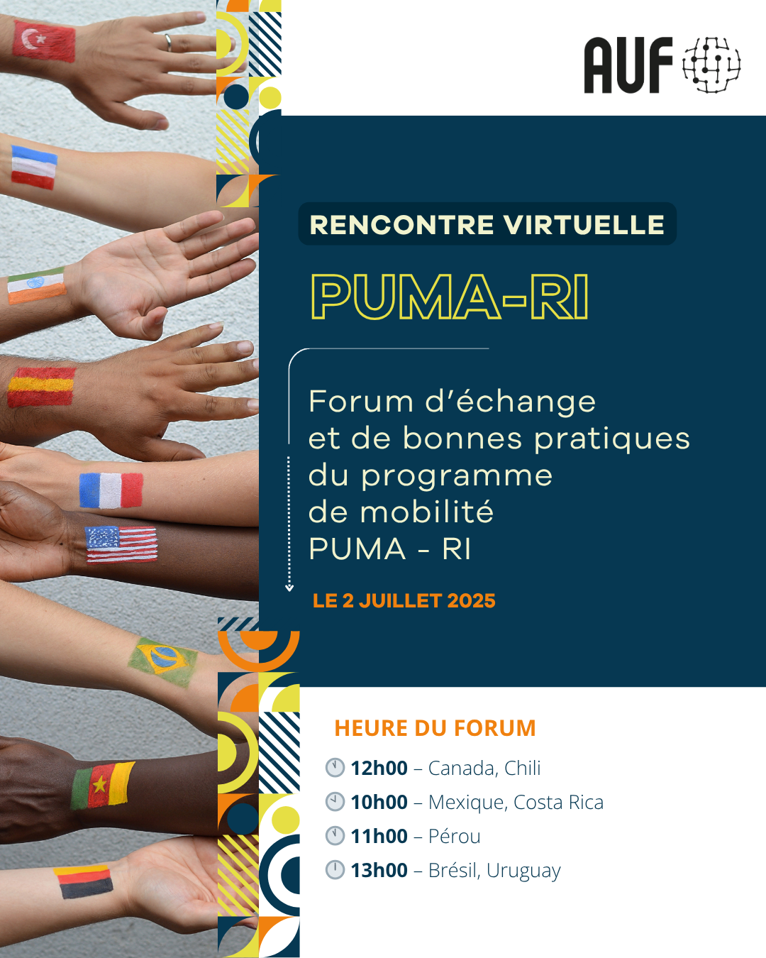 Le 2 juillet 2025, le Forum d’échange et de bonnes pratiques du programme PUMA-RI s’est tenu en ligne, à l’initiative de l’AUF – Amériques et de la Commission Mobilité de la CR2 –...