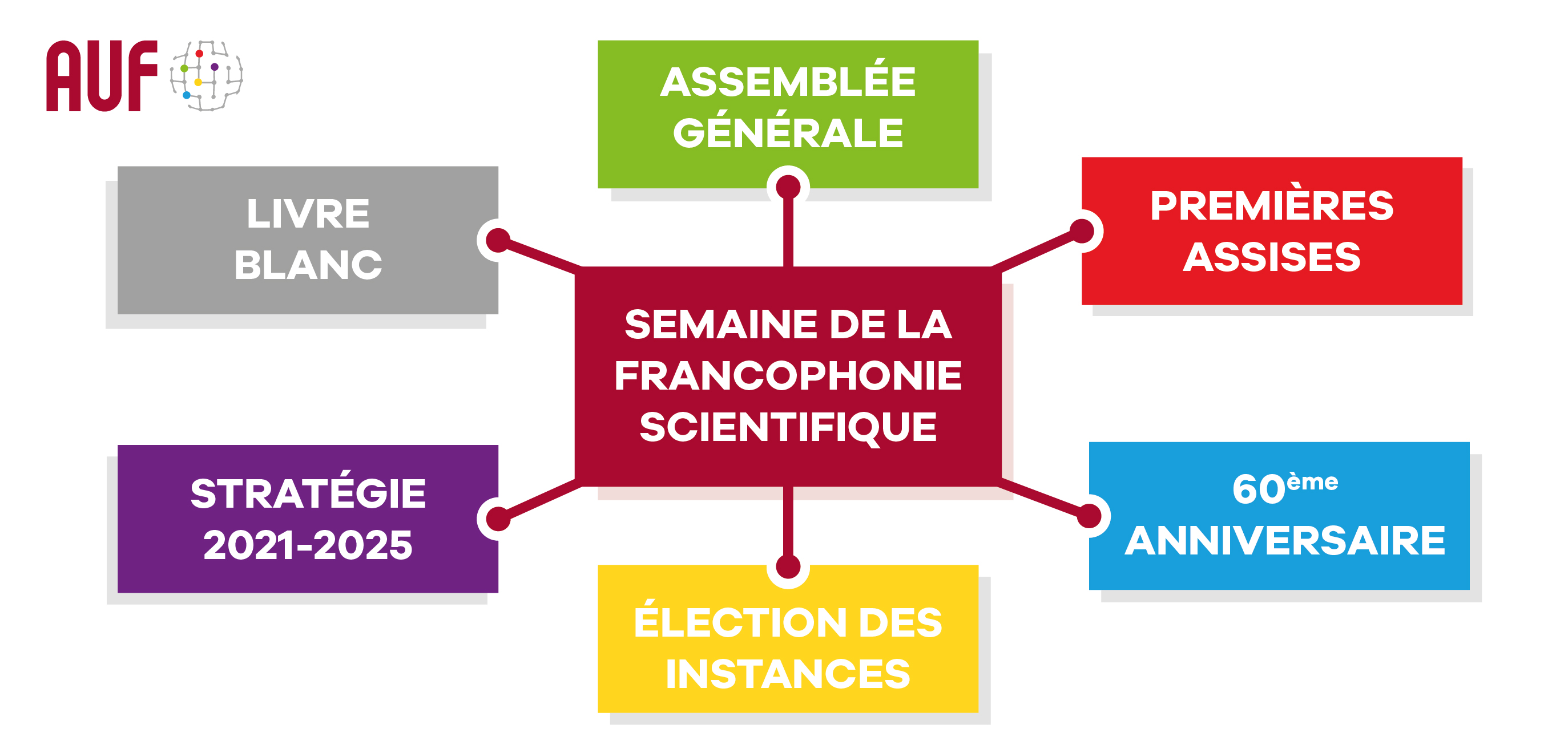 Créée le 13 septembre 1961 à Montréal (Canada) l’AUF fêtera en septembre 2021 son 60ème anniversaire. Ce jubilé célébrera la Francophonie scientifique dans le monde à travers de multiples évènements. Des évènements à caractère scientifique, festif et culturel se tiendront en présentiel et à distance (selon les modalités mises en place dans les pays dans le contexte la crise sanitaire).