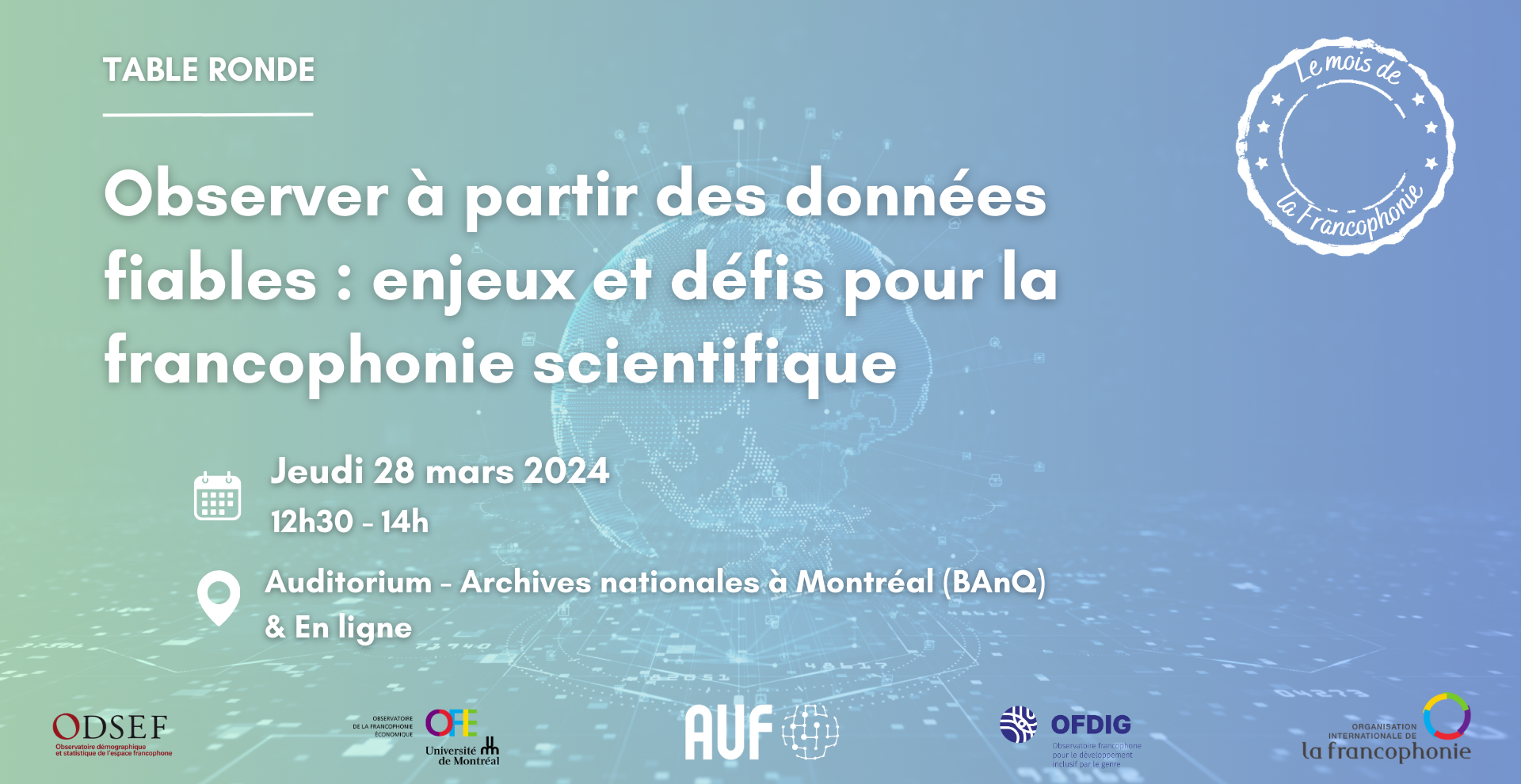 Dans le cadre du mois de la francophonie, l'Agence universitaire de la francophonie (AUF) organise un évènement grand public en collaboration avec l'Organisation internationale de la Francophonie (OIF) sur les enjeux et défis de la francophonie scientifique. Cet évènement sera l'occasion de valoriser l'expertise d'observatoires situés au Québec et soutenus par l'AUF : l'Observatoire francophone pour le développement inclusif par genre, l'Observatoire de la Francophonie économique et l'Observatoire démographique et statistique de l’espace francophone, ainsi que l'Observatoire de la langue française de l'OIF.
