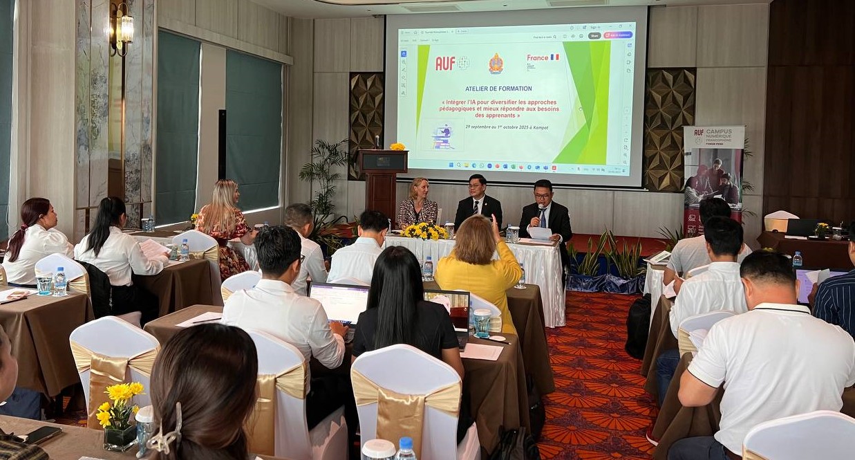 Du 29 septembre au 1er octobre 2025, 36 enseignants de français issus des établissements membres de l’Agence universitaire de la Francophonie (AUF) au Cambodge se sont réunis à Kampot pour participer à un atelier de formation de formateur intitulé « Intégrer l’intelligence artificielle pour diversifier les approches pédagogiques et mieux répondre aux besoins des apprenants ».