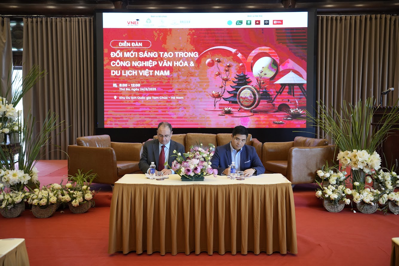 La signature a eu lieu dans le cadre du Forum national 2025, intitulé « Innovation dans les industries culturelles et touristiques au Vietnam », organisé par le VNEI, s’est tenu avec succès au site touristique écologique de Tam Chuc, à Ha Nam, réunissant de nombreux représentants des ministères, des universités, des entreprises ainsi que des experts nationaux et internationaux.