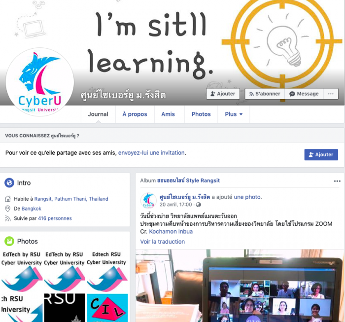 « Les réseaux sociaux constituent des outils de travail essentiels dans la plupart des universités thaïlandaises depuis des années. Quand l’épidémie de COVID-19 a interrompu l’enseignement en présentiel, avec la fermeture temporaire des universités, les groupes Facebook ont constitué notre moyen de communication principal. », a fait savoir M.Piyasuda Mawai, Doyenne de la Faculté de Français, Université Rangsit.