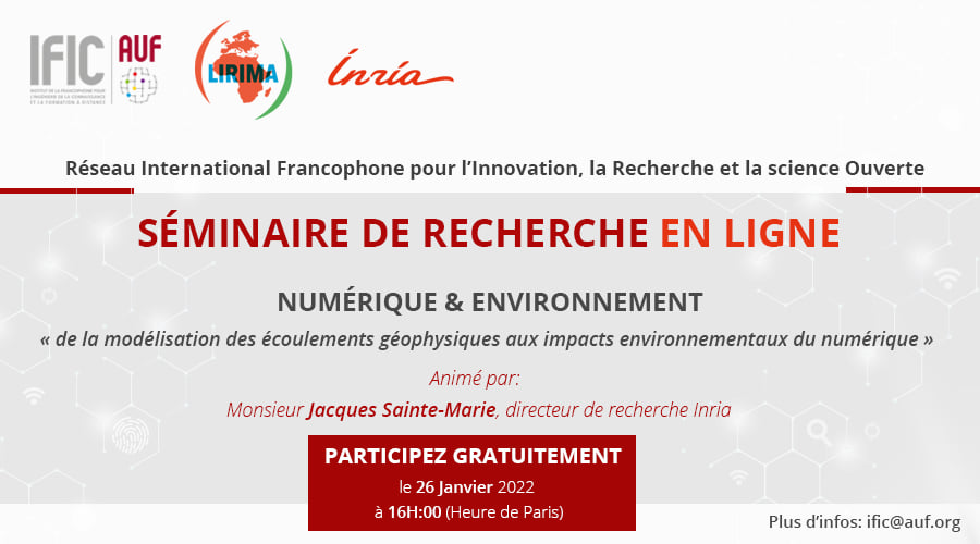 Dans le cadre des activités du Réseau International Francophone pour l’Innovation, la Recherche et la science Ouverte (RIFIRO), l’Institut de la Francophonie pour l'Ingénierie de la Connaissance et la formation à distance (IFIC ) et l’Institut national de recherche en sciences et technologies du numérique (INRIA) avec ses partenaires du LIRIMA, organisent un séminaire de recherche en ligne intitulé « Numérique et environnement - de la modélisation des écoulements géophysiques aux impacts environnementaux du numérique », le mercredi 26 janvier 2022 à 16H00 (heure de Paris). Ce séminaire est ouvert à toutes et tous.