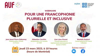 Réunissant quatre diplomates de quatre pays francophones, ce webinaire s’adressera en priorité aux jeunes étudiantes et étudiants, ainsi qu’au public s’intéressant aux actuels enjeux diplomatiques de la Francophonie dans le monde. L’échange portera à la fois sur la diversité des rapports personnels des participants avec la langue française, sur les enjeux institutionnels de la présence de cette langue dans la politique internationale aujourd’hui, ainsi que sur les défis, les opportunités et l’avenir d’une Francophonie plurielle et inclusive.