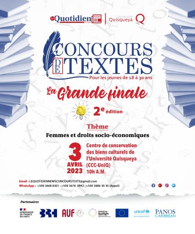 La 2e édition du Concours de textes contre la violence faite aux femmes du journal Le Quotidien News est organisée en partenariat avec l’UniQ et est supportée par la Banque de la République d’Haïti (BRH), l’Ambassade de France en Haïti, l’Institut Panos des Caraïbes, l’Agence Universitaire de la Francophonie, l’Initiative Spotlight, l’Union Européenne et l’UNICEF.