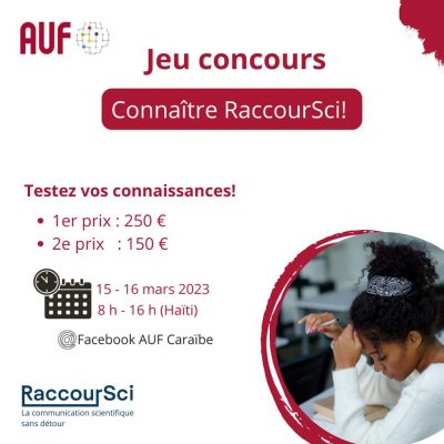Dans le cadre des festivités entourant la célébration de la Journée internationale de la Francophonie, le 20 mars, l’AUF Caraïbe s’allie à la plateforme RaccourSci pour proposer le jeu-concours régional: Connaissez-vous RaccourSci ?, les mercredi 15 et jeudi 16 mars prochains. L’activité se déroulera sur la page Facebook de l’AUF Caraïbe, entre 8h 00 et 16 h 00.