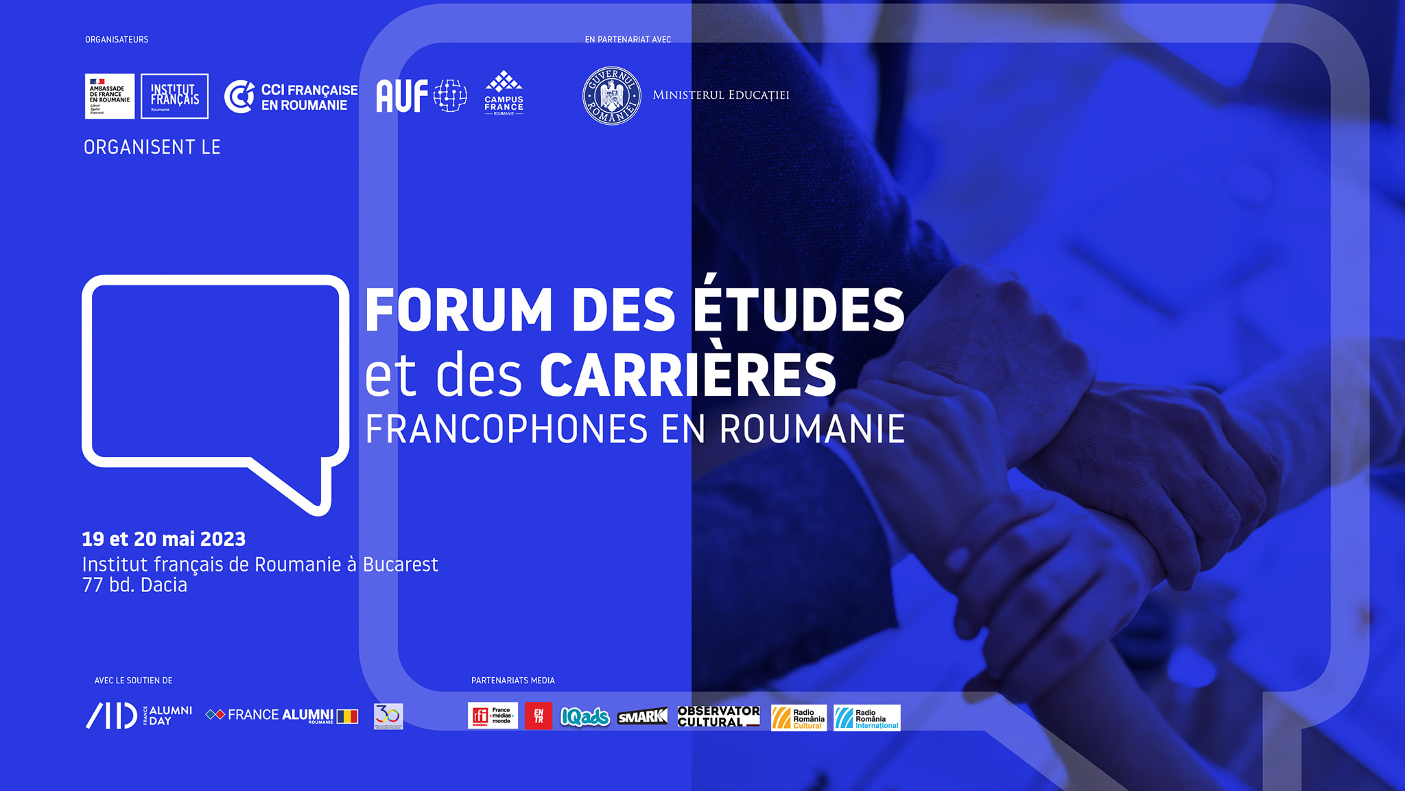 L’Ambassade de France/l’Institut français en Roumanie, l’Agence Universitaire de la Francophonie en Europe Centrale et Orientale et la Chambre Française de Commerce et d’Industrie en Roumanie (CCIFER), en partenariat avec le Ministère de l'Education de Roumanie, organisent le « Forum des carrières et des études francophones en Roumanie ». Il se tiendra les 19 et 20 mai 2023 dans les locaux de l’Institut Français à Bucarest.
