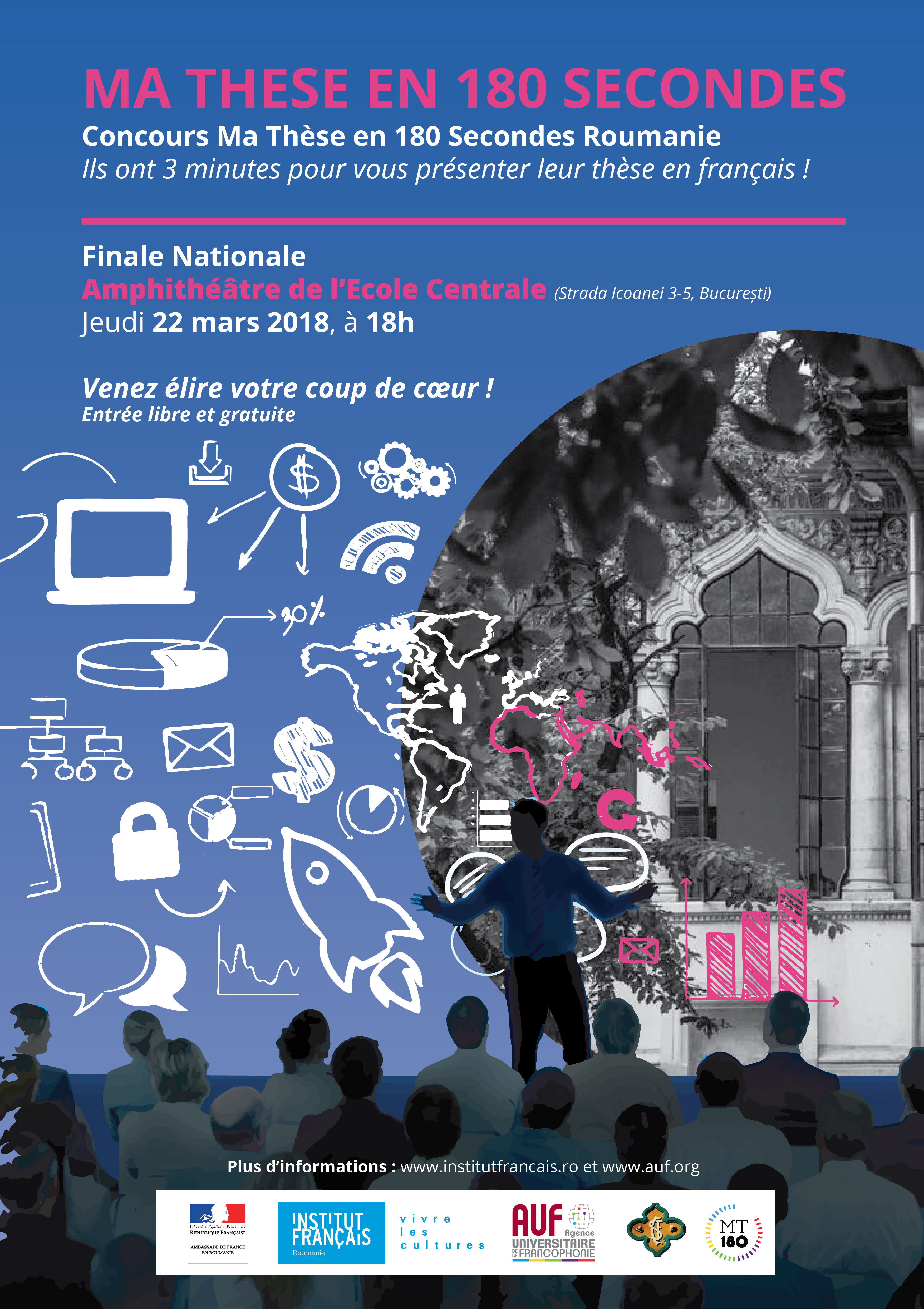 L’Agence universitaire de la Francophonie en Europe centrale et orientale et l'Institut Français de Roumanie vous donnent rendez-vous le jeudi 22 mars 2018, à 18h, à l’École Centrale de Bucarest (3-5, Rue Icoanei), pour la finale nationale du concours « Ma thèse en 180 secondes » en Roumanie !