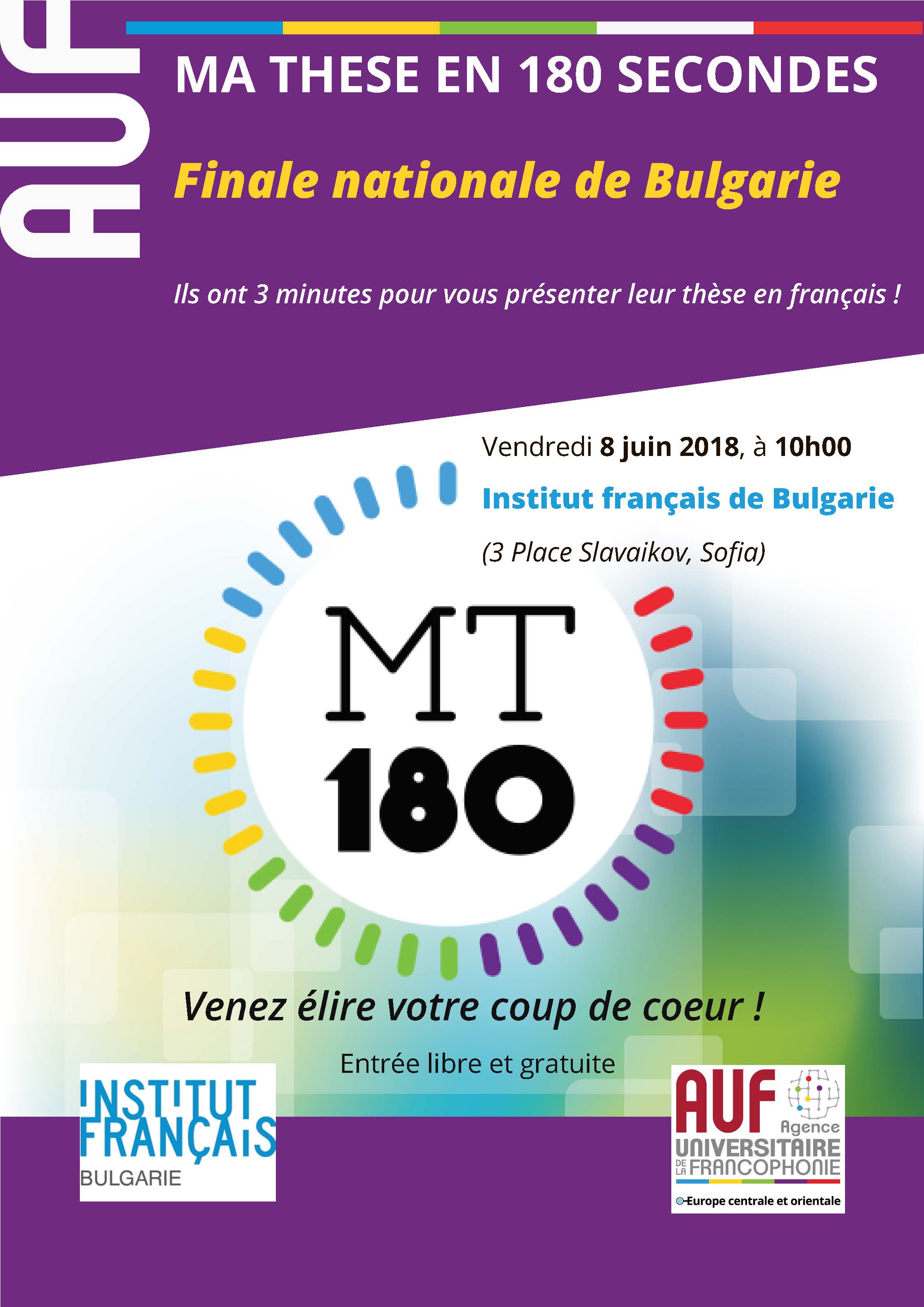 L’Agence universitaire de la Francophonie en Europe centrale et orientale et l'Institut Français de Bulgarie vous donnent rendez-vous le vendredi 8 juin 2018, à 10h00, à l’Institut français de Bulgarie (3 place Slavaikov, Sofia), pour la finale nationale du concours « Ma thèse en 180 secondes » en Bulgarie !