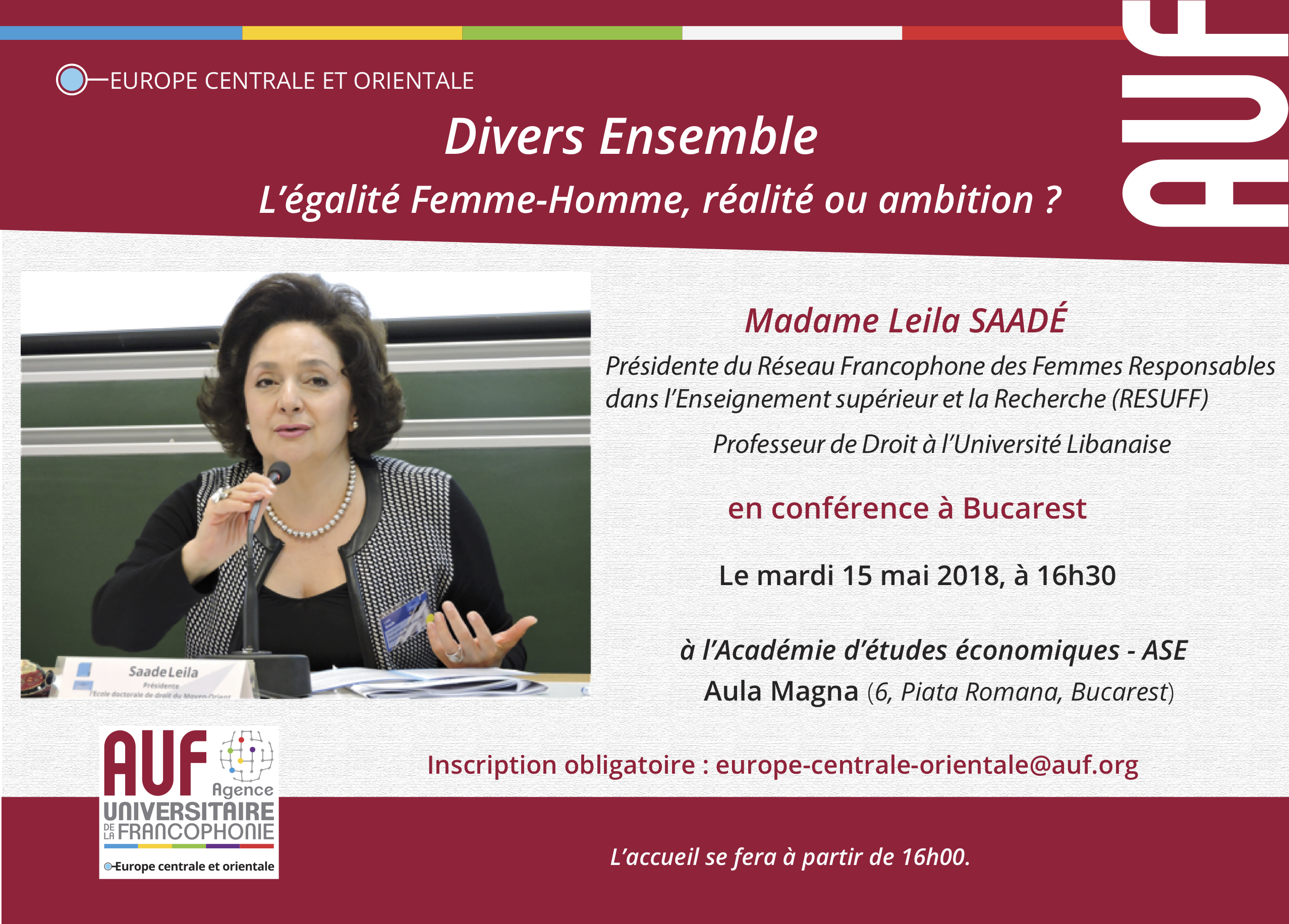 L’Agence universitaire de la Francophonie en Europe centrale et orientale organisera le 15 mai 2018 à Bucarest la Conférence « Divers Ensemble. L’égalité Femme-Homme, réalité ou ambition ? » donnée par Madame Leila SAADÉ, présidente du Réseau Francophone des Femmes Responsables dans l’Enseignement supérieur et la Recherche (RESUFF) et professeur de droit à l’Université Libanaise.
