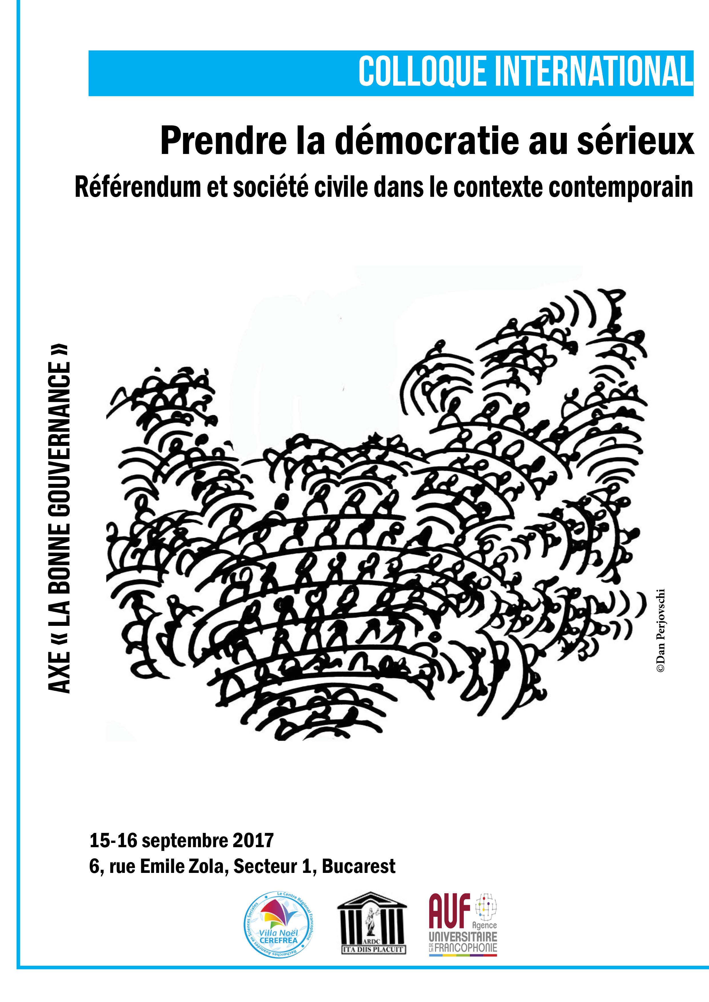 Le Centre Régional Francophone de Recherches Avancées en Sciences Sociales (CEREFREA Villa Noël) en partenariat avec l’Association Roumaine de Droit Constitutionnel, avec le soutien de l’Agence universitaire de la Francophonie, organise les 15 et 16 septembre 2017 à la Villa Noël (6, rue Emile Zola, secteur 1, Bucarest), le colloque international « Prendre la démocratie au sérieux – référendum et société civile dans le contexte contemporain ».