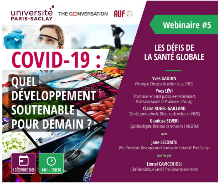 Dans le cadre  des réflexions collectives que suscite la pandémie de la COVID-19, une série de webinaires sur le développement soutenable organisés par l’Université Paris-Saclay donnent la parole aux experts de l’Université. Mis en place en collaboration avec le média en ligne The Conversation et l’AUF, ces webinaires ont pour but de croiser les disciplines et les regards, de manière à éclairer les différents aspects de cette crise sanitaire à l’aune des enjeux environnementaux.