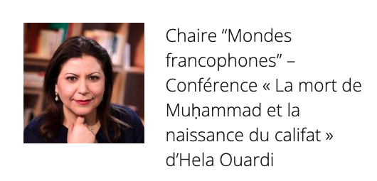 Hela Ouardi, professeure à l’Université La Manouba (Tunisie), a été élue titulaire de la Chaire « Mondes francophones » rattachée à l’Académie royale des Sciences, des Lettres et des Beaux-Arts de Belgique pour l’année académique 2021-2022. Elle prononcera sa conférence « La mort de Muḥammad et la naissance du califat » le mercredi 30 mars à 17h à l’Académie royale de Belgique.