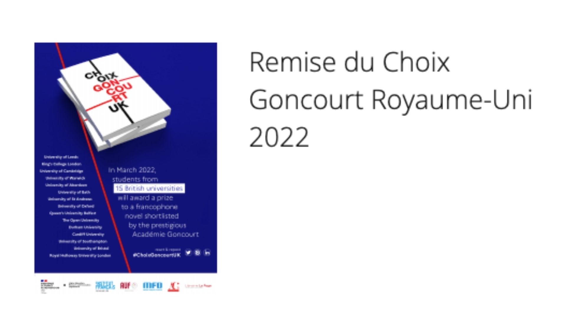 Le 25 mars 2022, les étudiants de 15 universités britanniques décerneront le Choix Goncourt Royaume-Uni pour sa troisième édition.