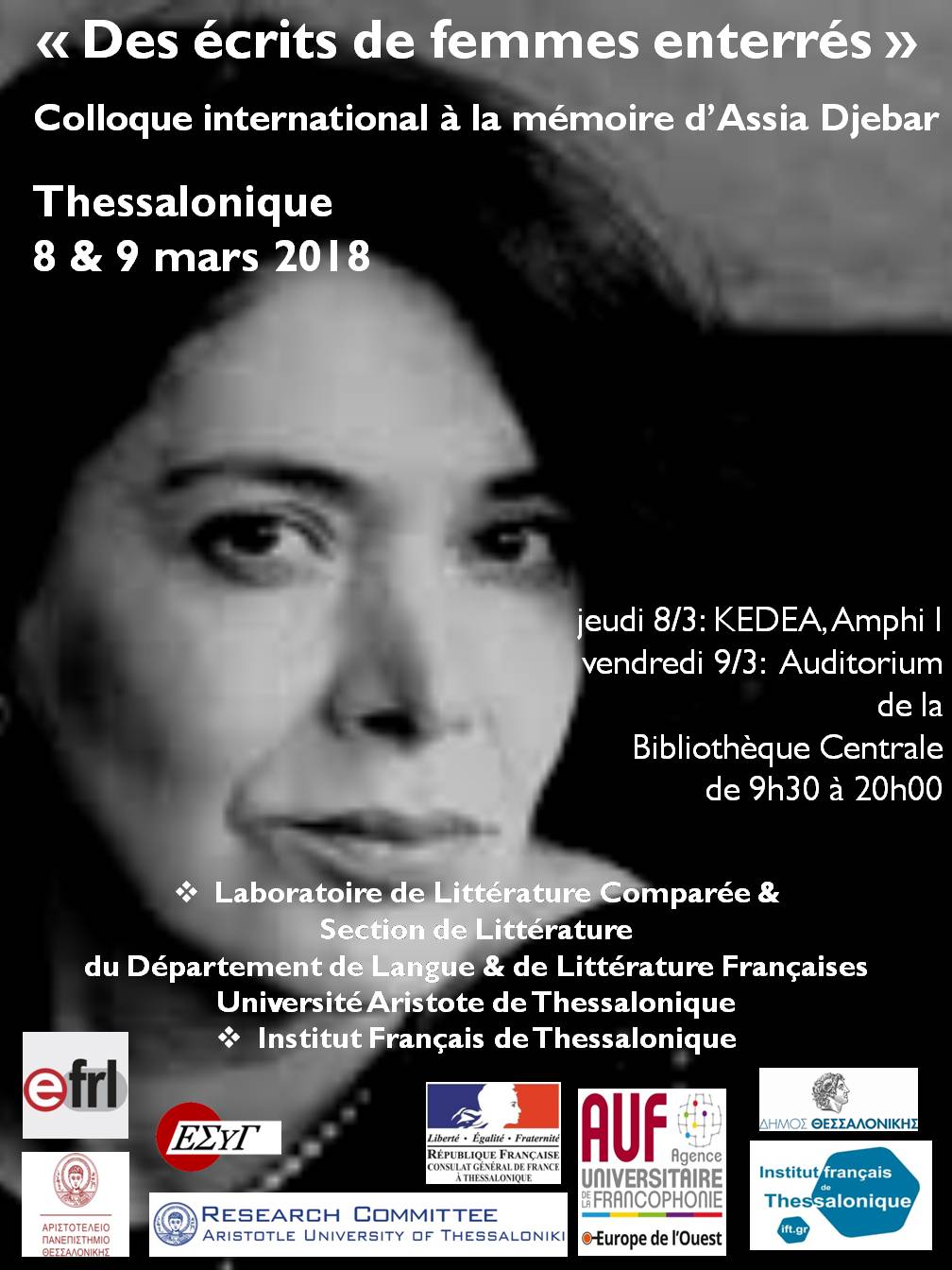 - 8-9 mars 2018, à Thessalonique (Grèce) :« Des écrits de femmes enterrés », colloque international à la mémoire d’Assia Djebar