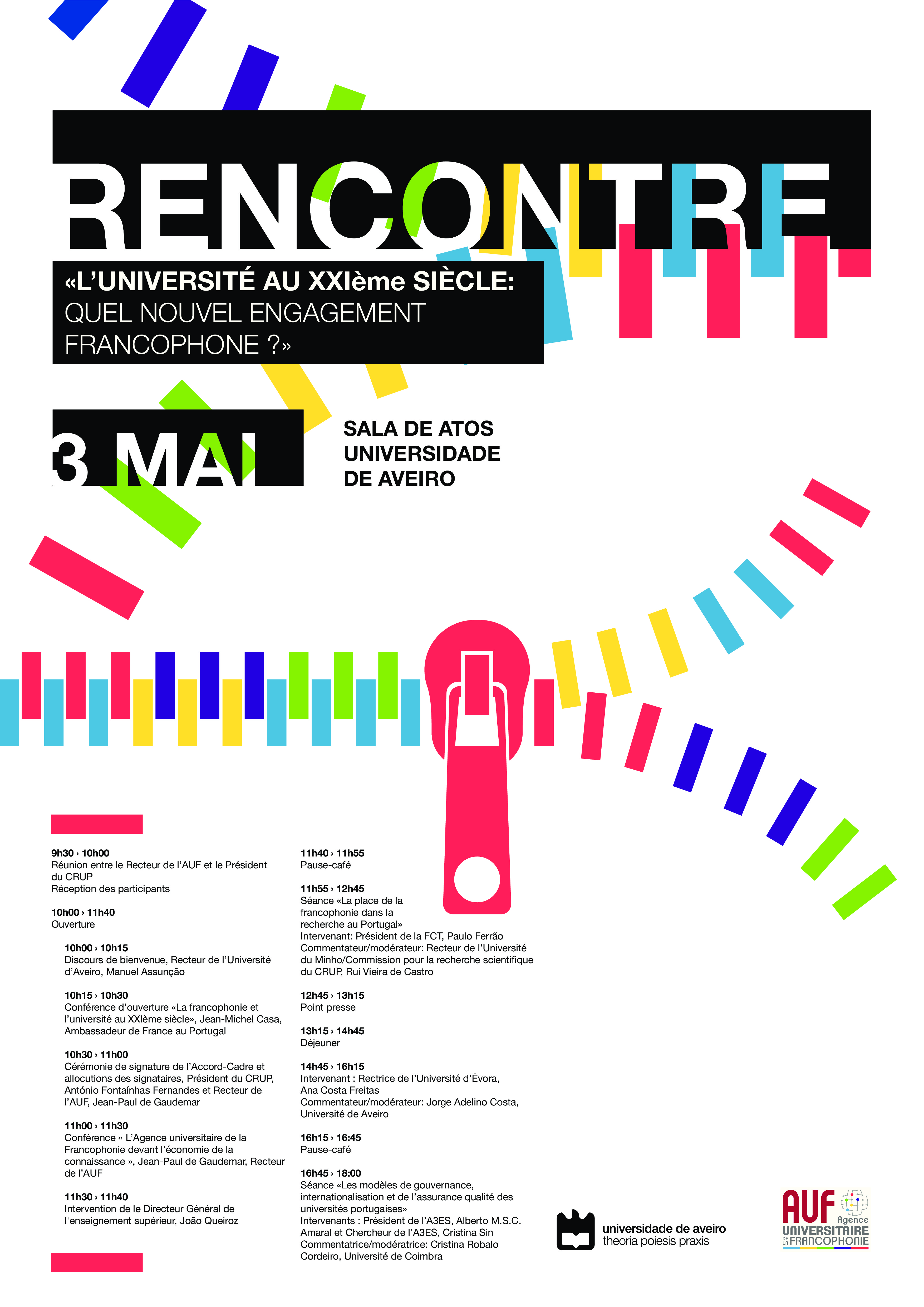 A l'occasion de la rencontre dédiée à "L'université au XXIè siècle : quel nouvel engagement francophone ?", organisée par l'Université d'Aveiro au Portugal, l'AUF et le Conseil des Recteurs des Universités Portugaises (CRUP) ont signé le jeudi 3 mai 2018, un accord-cadre de partenariat.