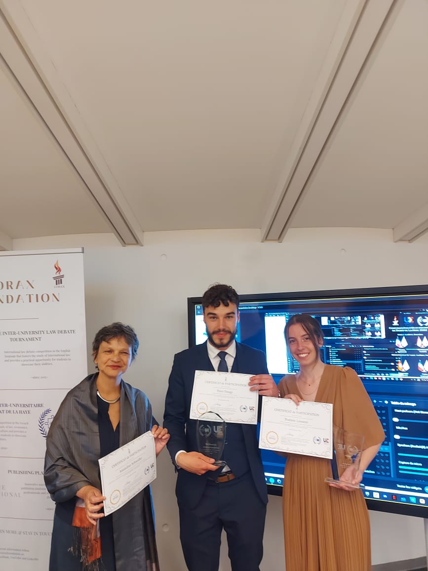 Enzo Daugy, Noémie Lesueur et Amandine Schneider, étudiants à l’Université de Tours (France) et membres de l’Association Tours Éloquence sont les 1ers vainqueurs du Concours Interuniversitaire de Débat de La Haye. Ils affrontaient ce 24 juin Antoine Daher, Marc Morkos et Andréa Zmokhol, étudiants à l’Université Saint-Joseph de Beyrouth (Liban), vice-champions du Concours 2022.
