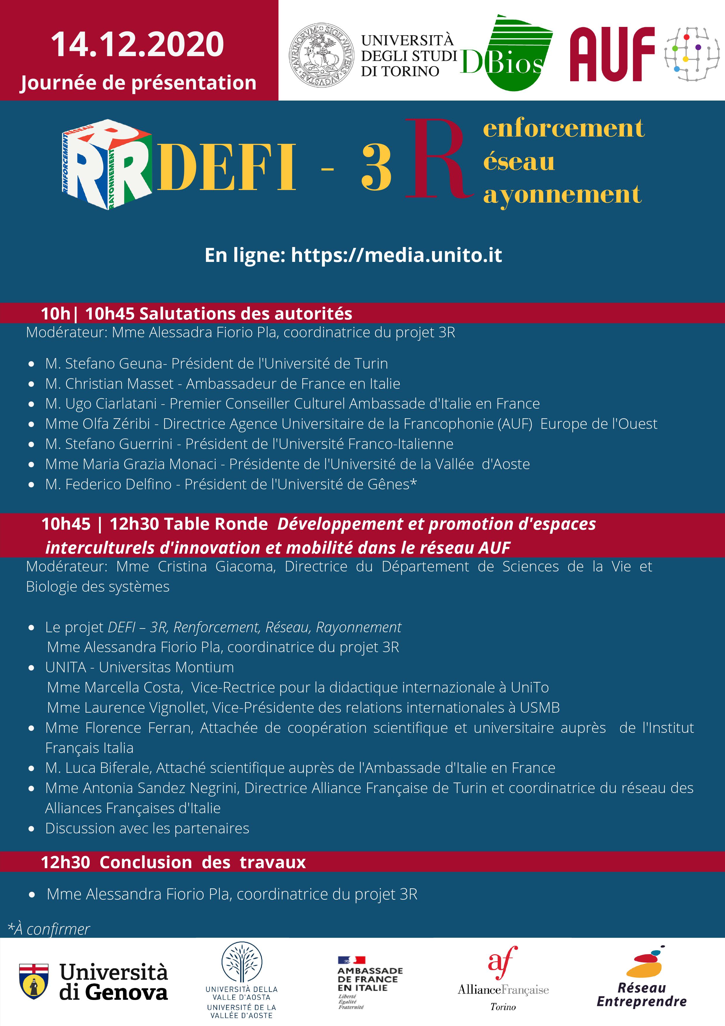 Le 14 décembre 2020 se tiendra la journée de présentation du projet de l’Université de Turin, dénommé DEFI 3R, Renforcement, Réseau, Rayonnement.