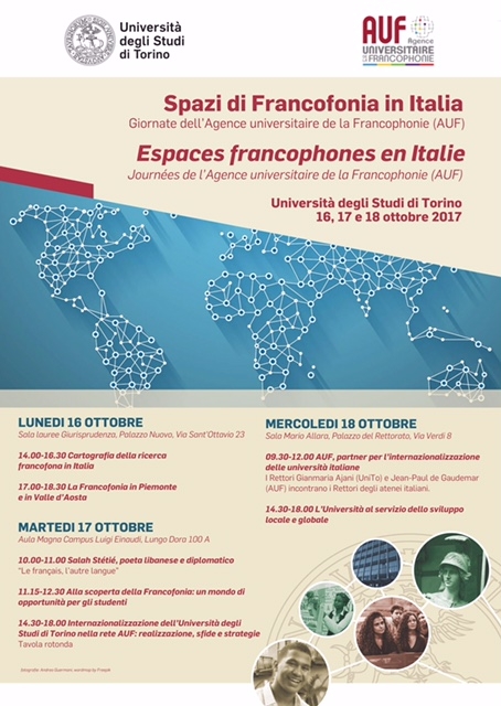 A l'occasion de l'évènement "Espaces francophones en Italie", l'Université de Turin organise, du 16 au 18 octobre 2017, les Journées de l'Agence universitaire de la Francophonie.