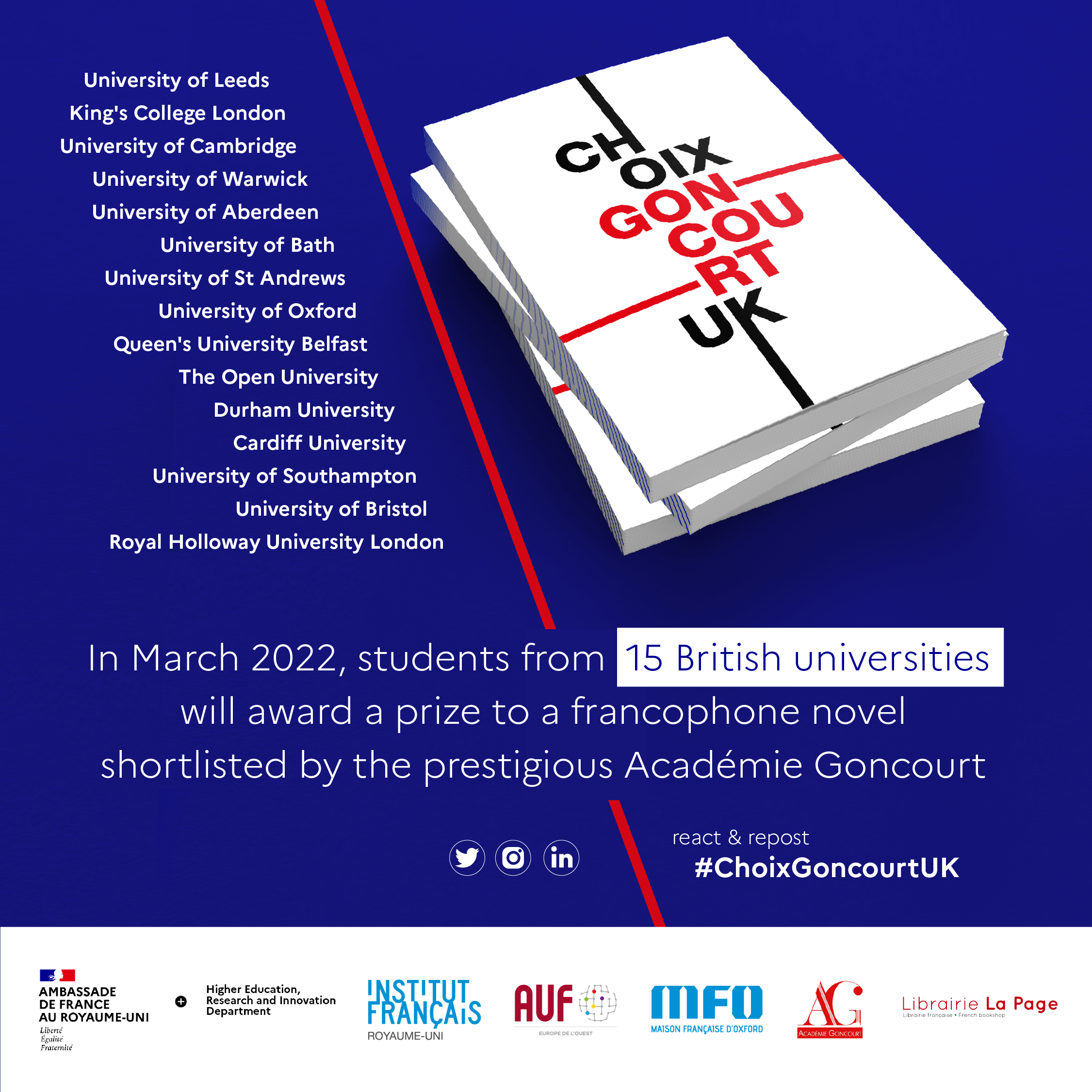 Le service Enseignement supérieur Recherche et Innovation de l’Ambassade de France au Royaume Uni et l’Institut français du Royaume-Uni, en partenariat avec l’Académie Goncourt, la Maison Française d’Oxford, l’Agence Universitaire de la Francophonie Europe de l'Ouest et la Librairie La Page, organisent le Choix Goncourt du Royaume-Uni pour les étudiant-e-s des universités britanniques.