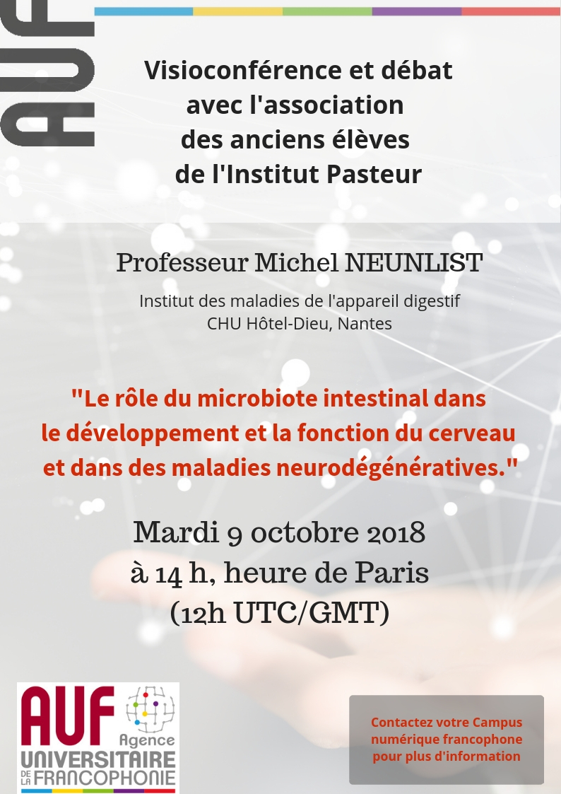 En collaboration avec l'Association des Anciens Élèves de l'Institut Pasteur (AAEIP) et la Direction Déléguée de l'Enseignement de l'institut Pasteur, l'Université de Nantes, la Direction régionale Europe de l'Ouest et les Campus numériques francophones de l'Agence universitaire de la Francophonie organisent une visioconférence suivie d'un débat scientifique le mardi 9 octobre (14h, heure de Paris).