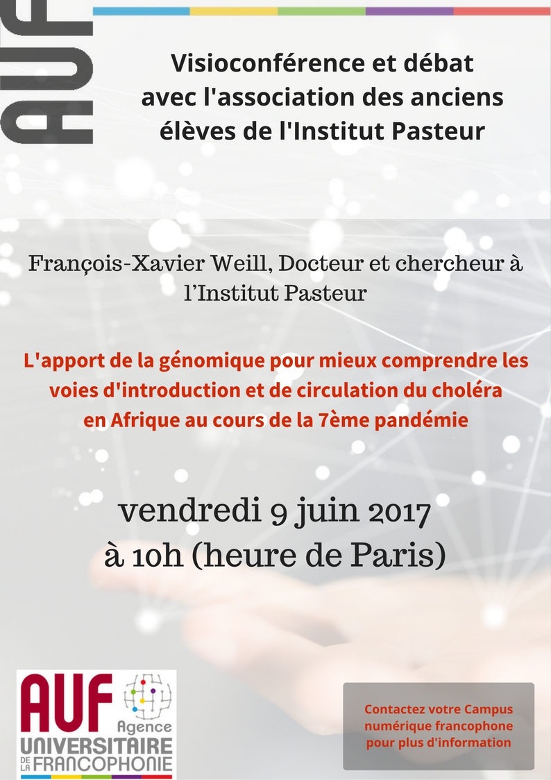 En collaboration avec l'Association des Anciens Élèves de l'Institut Pasteur (AAEIP) et la Direction Déléguée de l'Enseignement de l'institut Pasteur, la Direction régionale Europe de l'Ouest de l'Agence universitaire de la Francophonie et les Campus numériques francophones organisent une visioconférence suivie d'un débat scientifique le vendredi 9 juin 2017 (10h, heure de Paris).