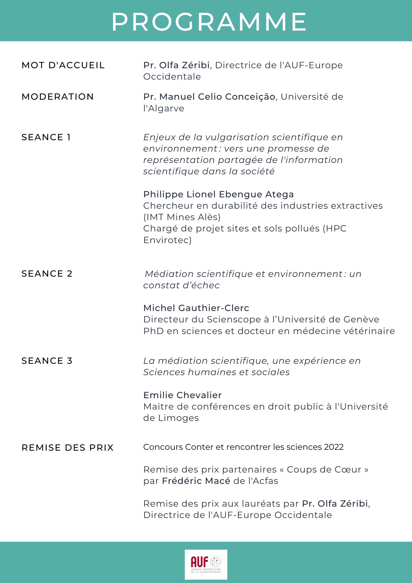 L’AUF-Europe Occidentale a décidé de mettre à l’honneur les 4 lauréat.e.s de son concours de vulgarisation en organisant le jeudi 15 juin une table ronde dédiée à la médiation scientifique en présence de spécialistes du domaine.